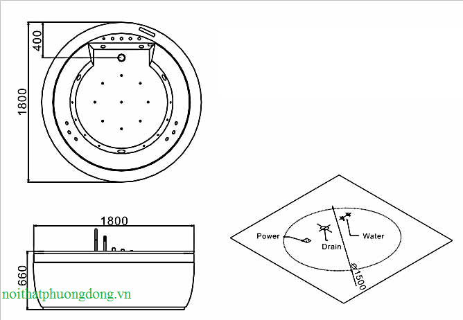-Kích thước:1800-1800-660 mm ( đường kính x chiều cao ) dạng tròn có thể đặt ở giữa phòng, phù hợp với những không gian phòng tắm rộng.