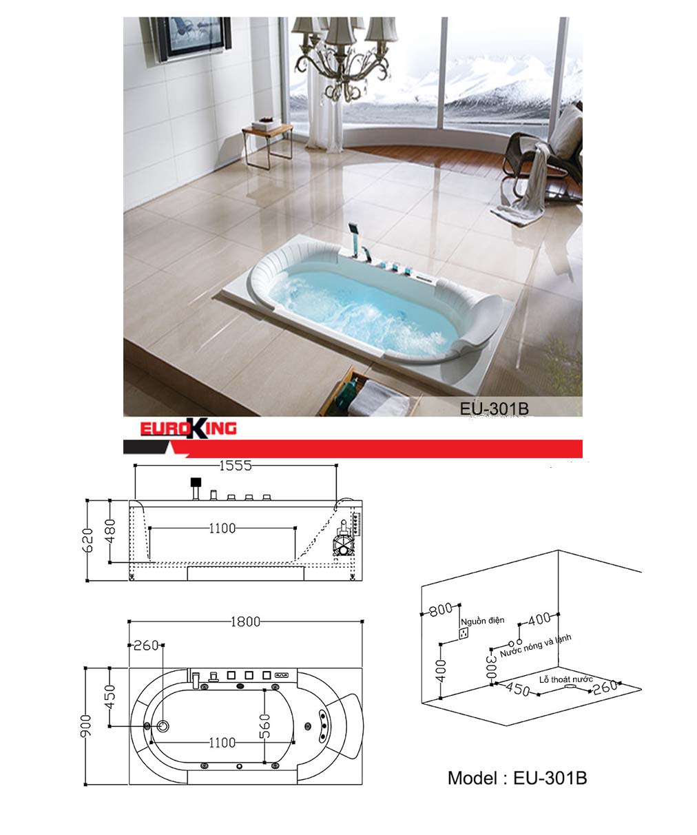 Kích thước 3 chiều dài x rộng x cao tổng thể của bồn tắm massage EU-301B lần lượt là 1800 x 900 x 620 mm. Bồn tắm massage cao cấp EU-301B phù hợp với những phòng tắm tương đối rộng rãi. Chúng ta dành 1,6m2 cho diện tích của bồn tắm và một phần bệ xung quanh. Nếu phòng tắm của gia đình chúng ta lớn hơn 10m2 thì có thể cân nhắc đến lựa chọn này.