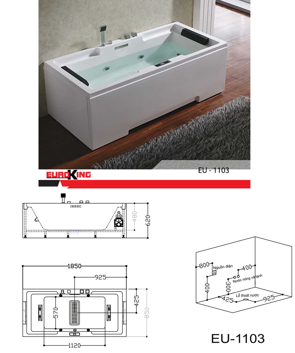 -EU-1103 là chiếc bồn tắm massage được thiết kế dành riêng cho những phòng tắm diện tích nhỏ. Về tổng thể, kích thước 3 chiều của EU-1103 là 1850 x 850 x 620 mm tương ứng với các chiều dài x rộng x cao.