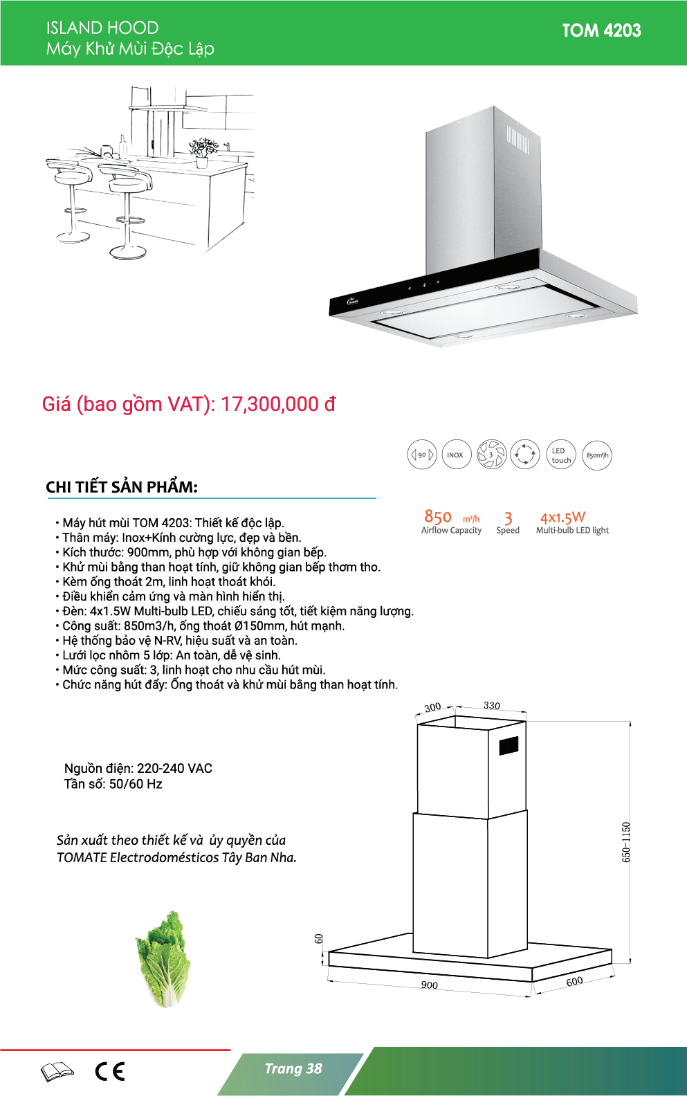 Thông số kỹ thuật máy hút mùi Tomate TOM 4203