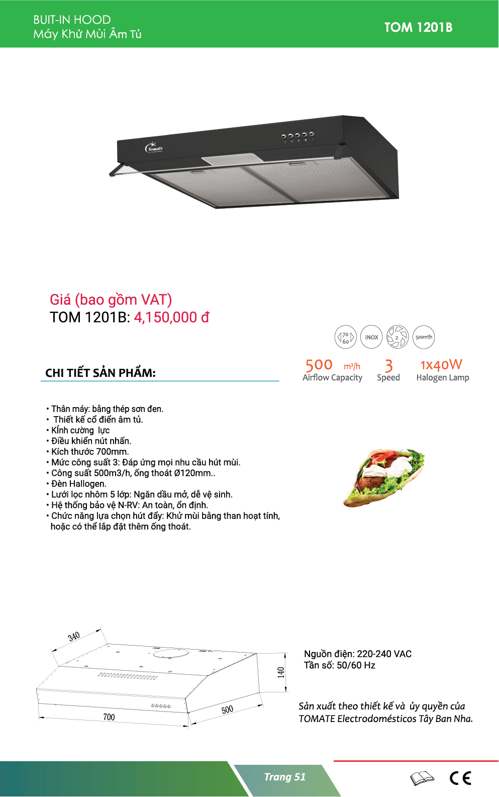 Với công suất hút 500m3/h và khả năng lọc không khí trong không gian nhà bếp, TOM 1201B là sự lựa chọn lý tưởng để tạo ra một không gian sạch sẽ, thông thoáng và môi trường ẩm thực tốt cho bạn và gia đình của bạn.