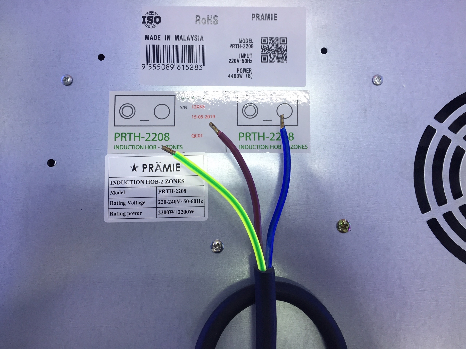 Bếp từ Pramie PRTH-2208 sử dụng hệ thống dây điện đấu trực tiếp vào aptomat, bạn nên sử dụng riêng một aptomat riêng cho bếp để bảo vệ linh kiện bên trong thân vỏ của bếp.