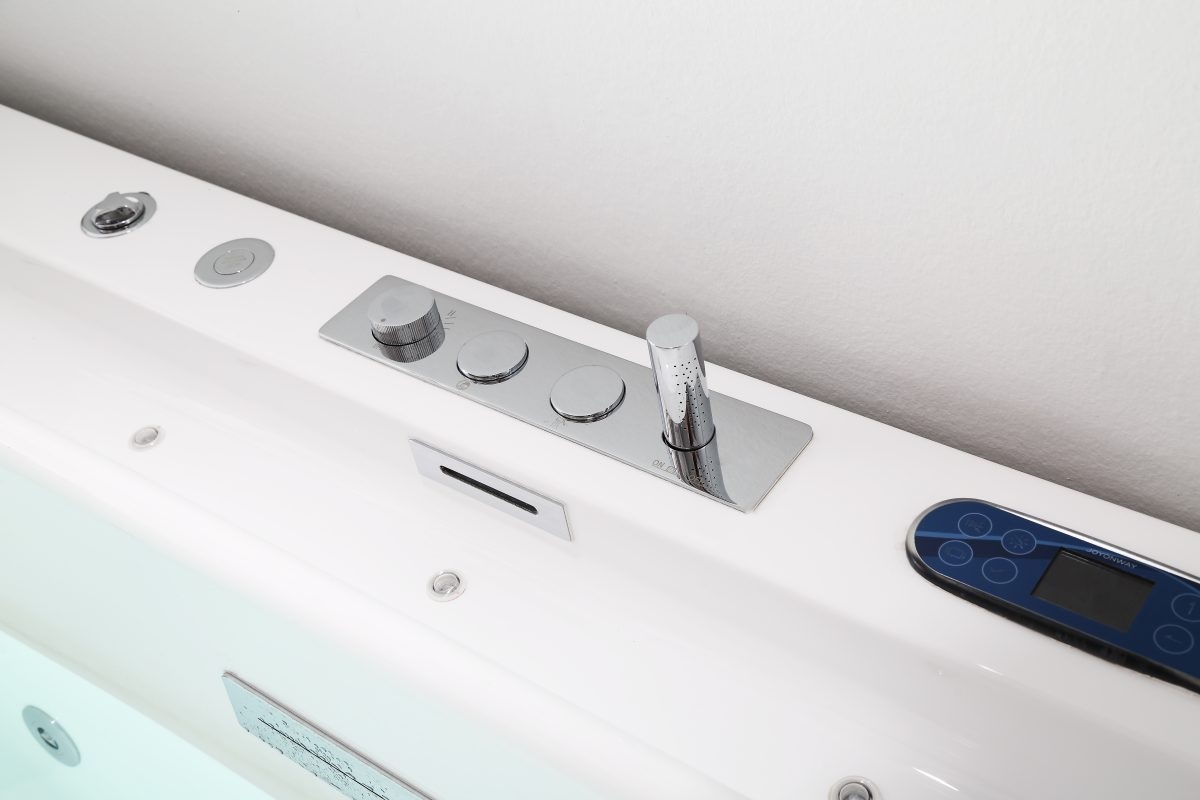 Cũng trên thành bồn là hệ thống vòi sen, các nút điều chỉnh và bảng điều khiển.. Kết hợp với màu trắng của bồn khiến cho tổng thể bồn tắm thêm sang trọng. Mang lại cho bồn tắm G-9268 vẻ đẹp tinh khôi, trong sáng.