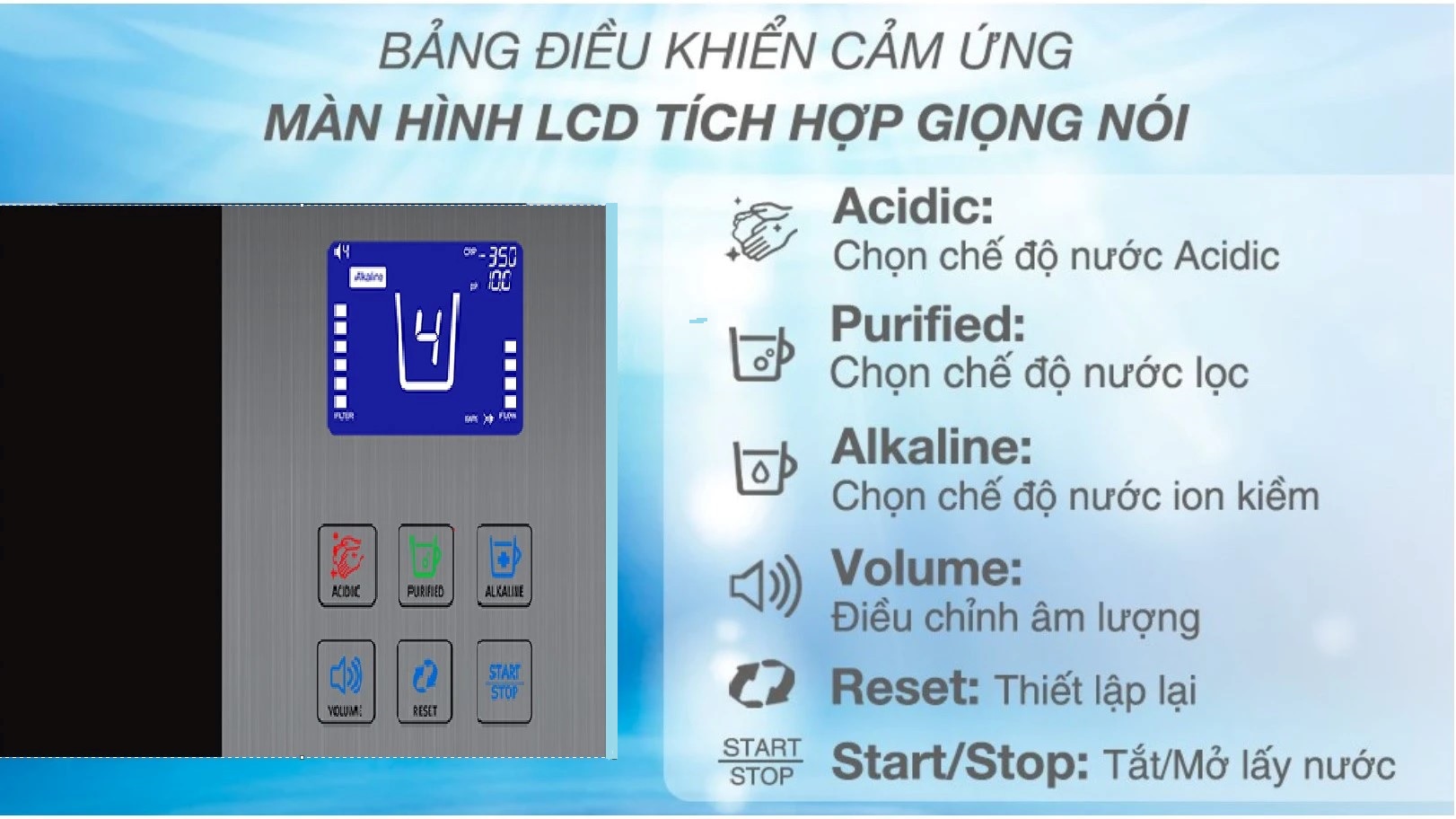 Máy lọc nước Ion Kiềm IONPIA 5000-7 mang tới cho bạn phong cách sống đẳng cấp nhờ hệ thống điều chỉnh nút cảm biến màn hình LCD. Các phím được minh họa bằng hình ảnh màu sắc đẹp mắt, giúp người dùng phân biệt dễ dàng các loại nước alkaline, nước acid và nước lọc sạch.