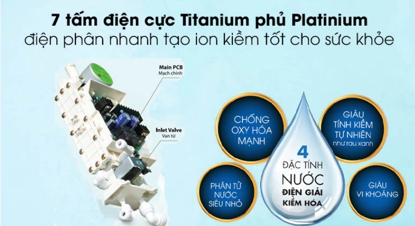 - Tiện ích: Tạo kiềm Alkaline làm đẹp da, bổ sung khoáng chất và điện giải, 7 tấm điện cực Titanium phủ bạc Platinum cao cấp, nước ion kiềm tạo hydrogen.