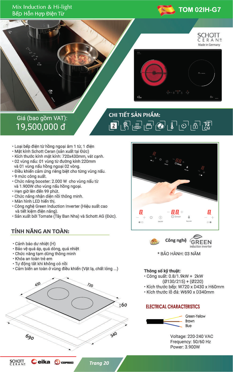 Bếp điện từ hồng ngoại Tomate TOM 02IH-G7 là sản phẩm bếp nhập khẩu cao cấp từ Tây Ban Nha, thiết kế theo chuẩn TOMATE (Tây Ban Nha). Với đặc tính điện từ dạng Horizontal, bếp từ hồng ngoại Tomate TOM 02IH-G7 này sử dụng 02 vùng nấu, trong đó có 01 vùng nấu từ và 01 vùng điện, 02 vòng nhiệt đốt nóng linh hoạt sử dụng thanh đốt chịu nhiệt.