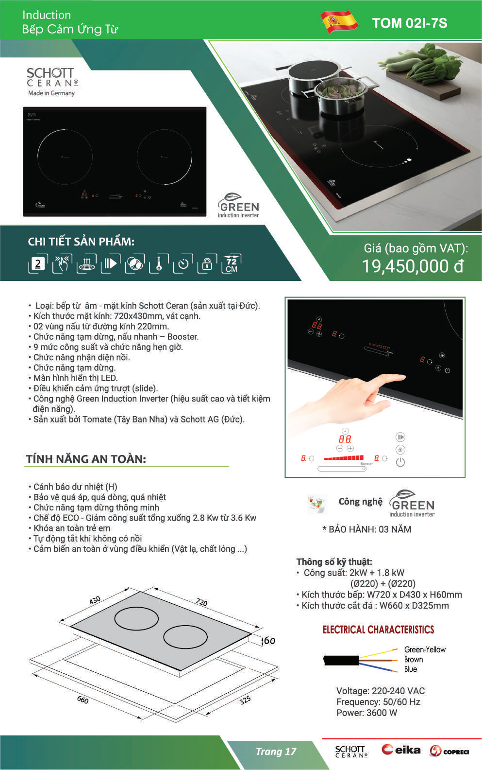 - Tự động chia sẻ công suất giữa 2 bếp Tổng công suất 3,6 Kw