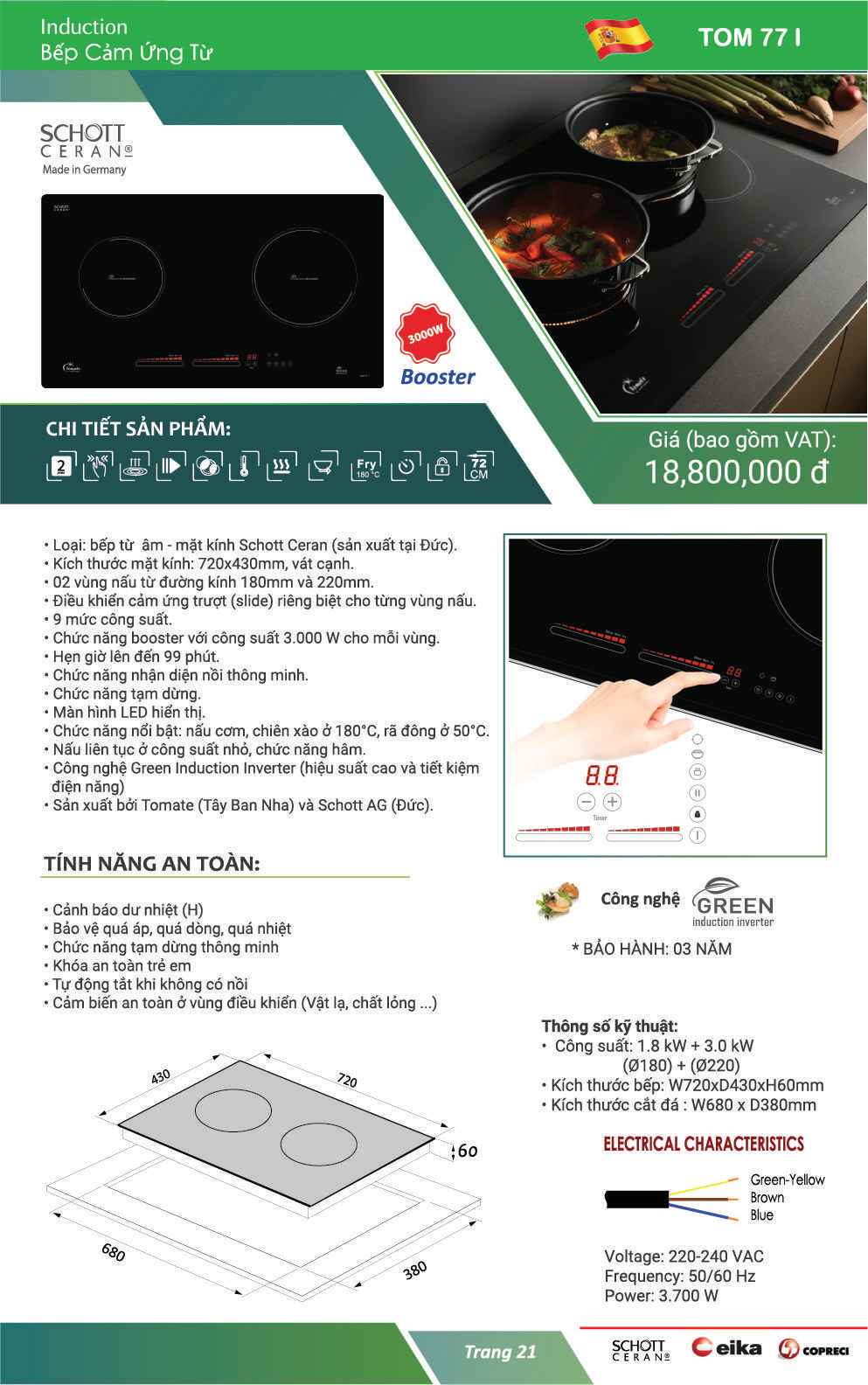 * Thông số kỹ thuật bếp từ Tomate TOM 77I