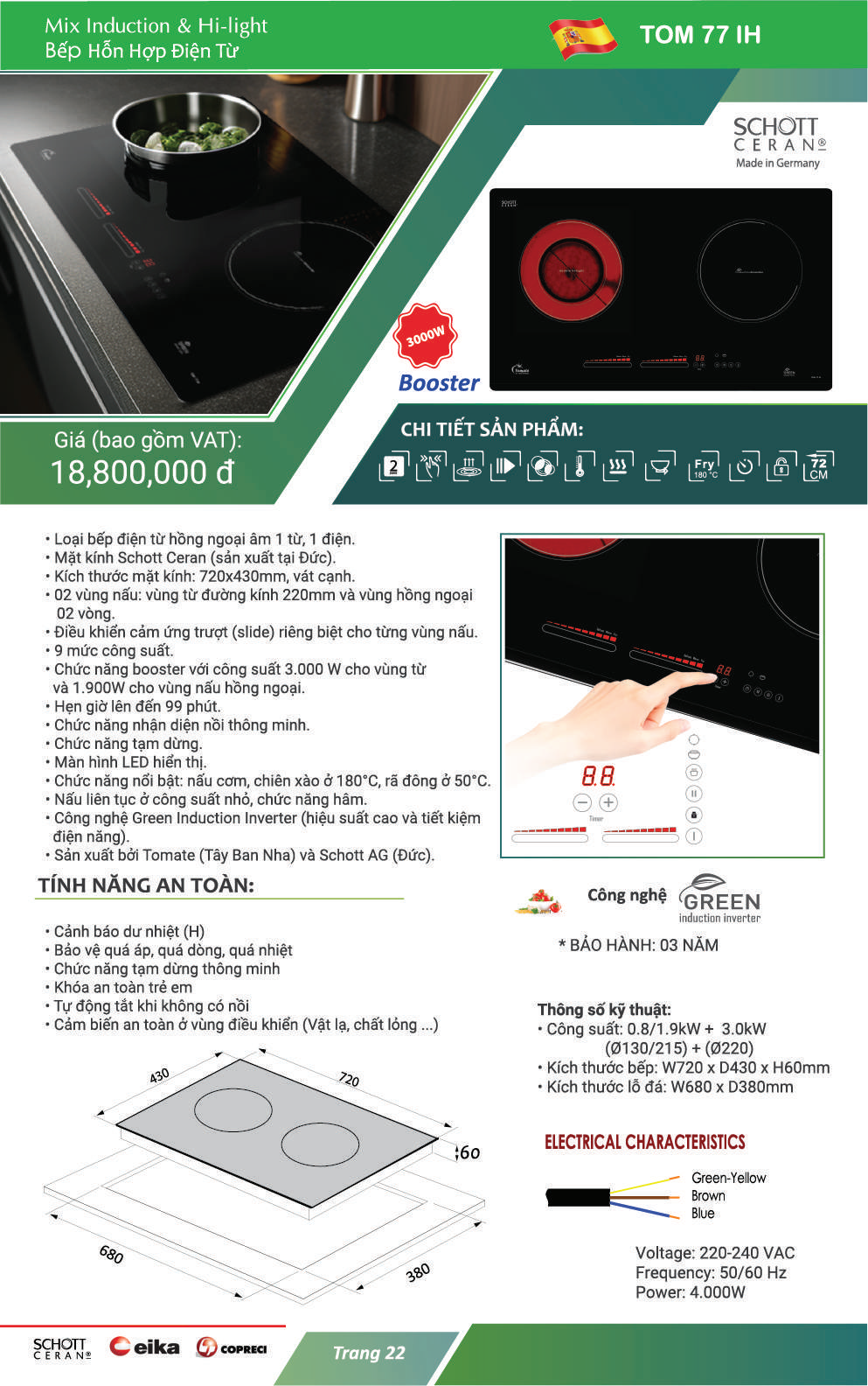 * Thông số kỹ thuật bếp điện từ Tomate TOM 77IH
