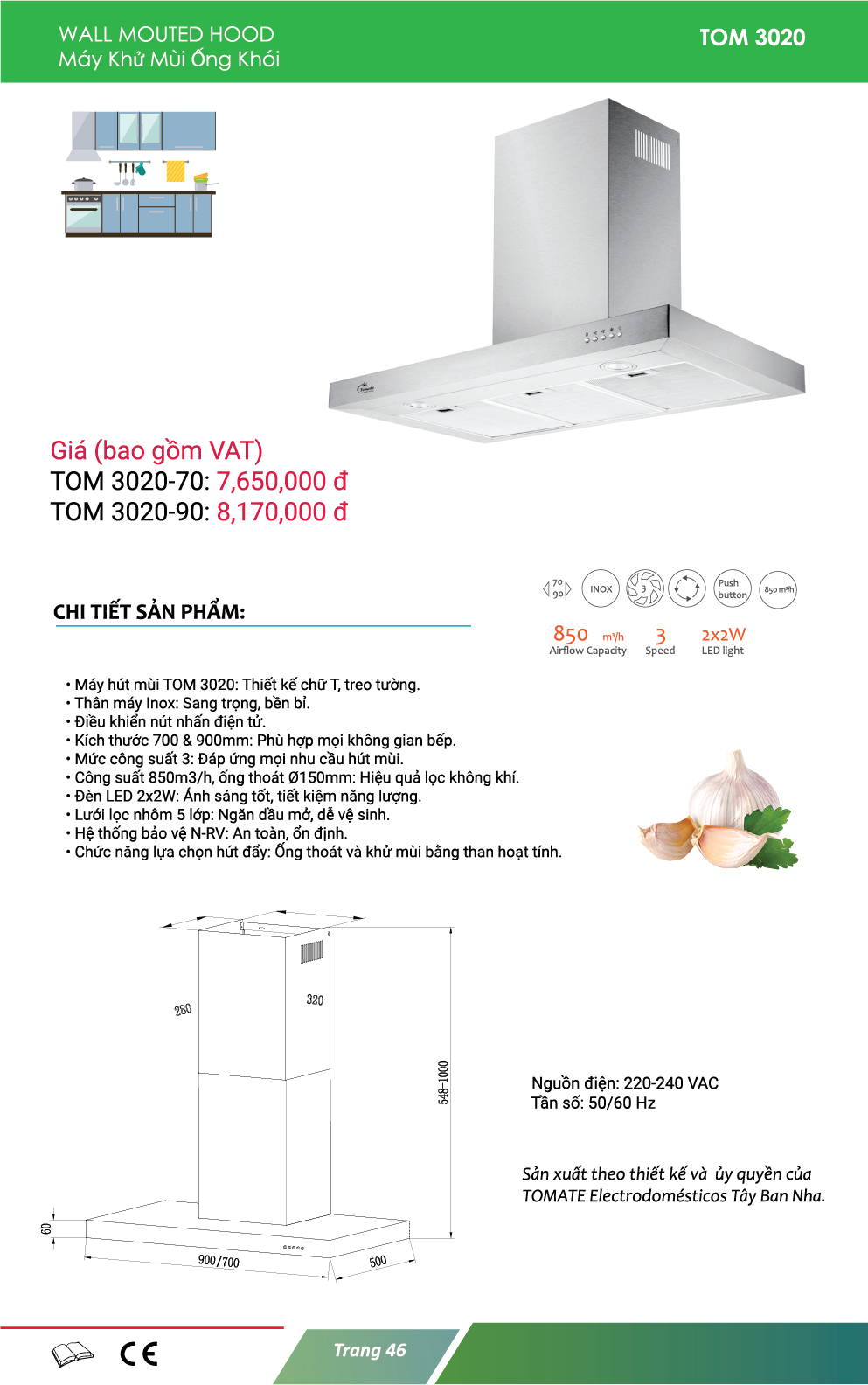 Sản phẩm Tomate TOM 3020 90cm được thiết kế theo tiêu chuẩn cao của thương hiệu TOMATE từ Tây Ban Nha, đảm bảo chất lượng và đáng tin cậy. Bạn có thể hoàn toàn yên tâm với hiệu suất hút mùi tuyệt vời mà máy hút mùi này mang lại.
