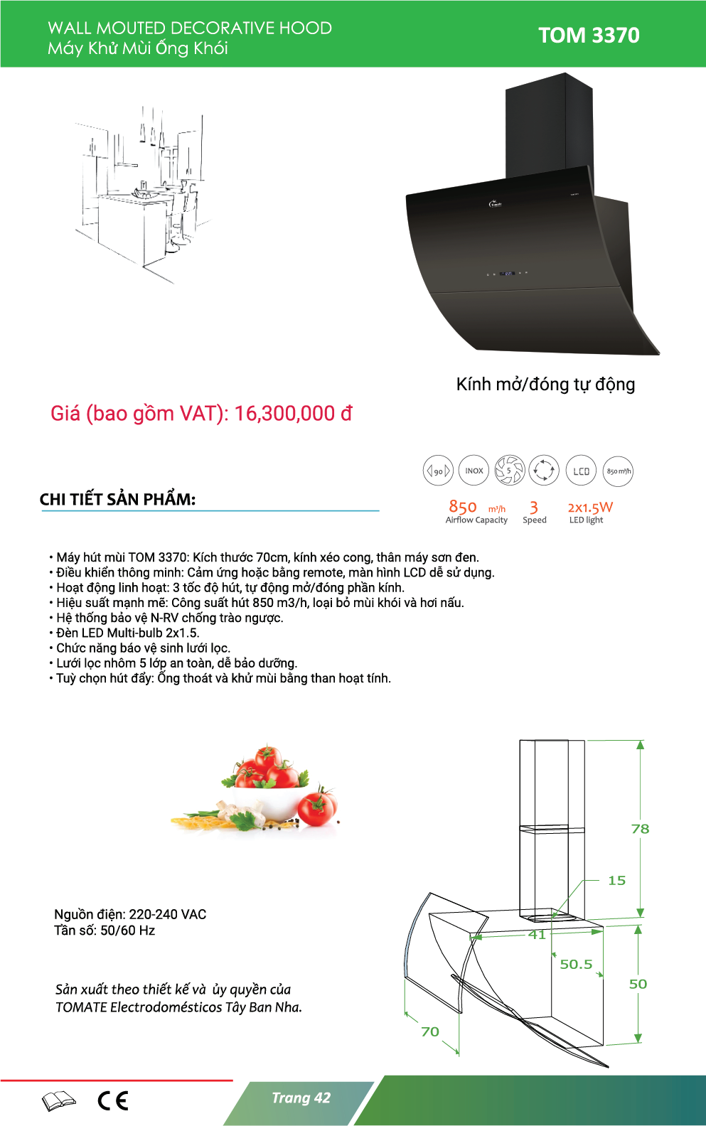 Thông số kỹ thuật máy hút mùi kính vát Tomate TOM 3370