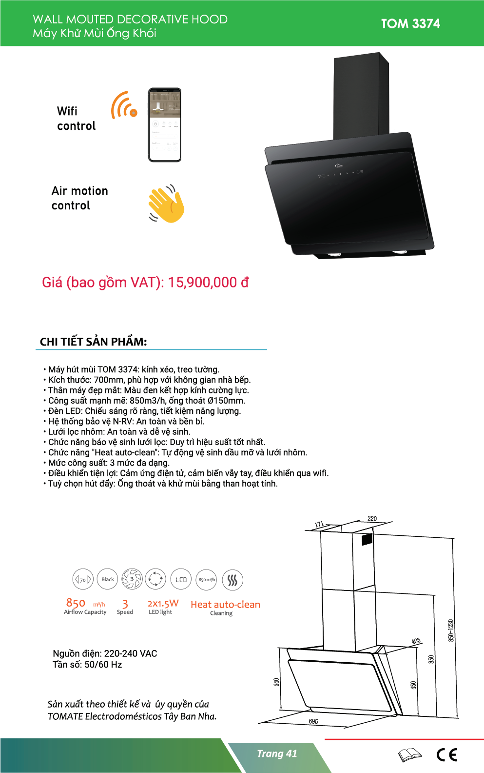 Thông số kỹ thuật máy hút mùi Tomate TOM 3374