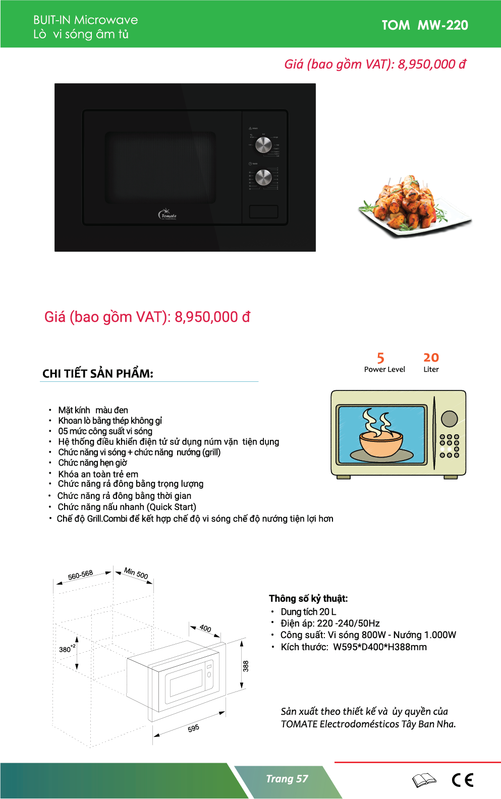 Thông số kỹ thuật lò vi sóng âm tủ Tomate TOM MW-220