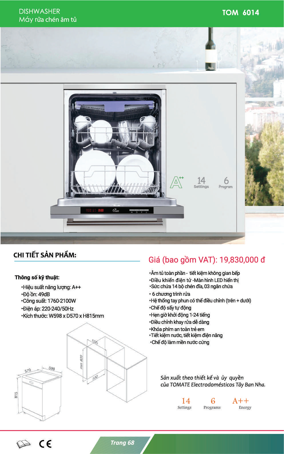 Thông số kỹ thuật máy rửa bát Tomate TOM 6014