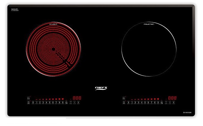 * Bếp điện từ CHefs Mix-386 có cấu tạo hai bếp tương đối khác - bếp điện sẽ ở bên phải so với các bếp khác ở bên trái, bếp điện có hai vòng và có thể chủ động thu nhỏ 1 vòng và 2 vòng tùy từng món ăn và nồi nấu.