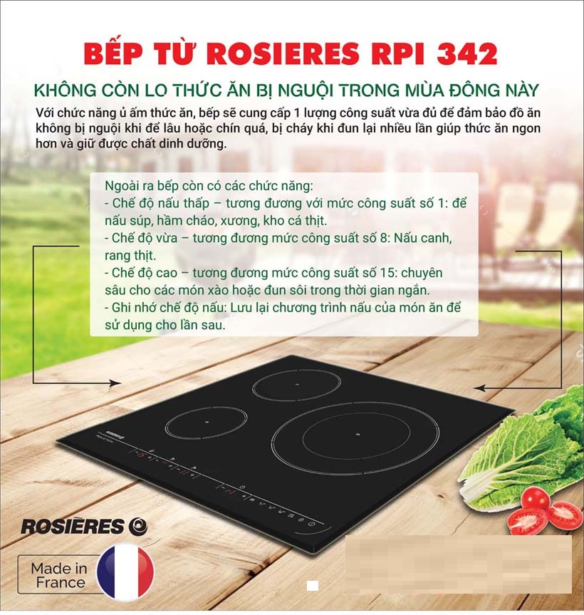 Bếp từ Rosieres RPIF342 có 3 vùng nấu từ thiết kế dạng bếp vuông phù hợp với những phòng bếp rộng. Bề mặt bếp được chế tạo từ kính cường lực cao cấp thời trang, hiện đại và dễ dàng vệ sinh, phía trước của mặt bếp còn được kết hợp với viền Inox phía trước ngay phía dưới bảng điều khiển tạo nên một phong cách độc đáo và hoàn toàn mới lạ cho mẫu bếp Rosieres RPIF342. Với ưu điểm là hàng nhập khẩu nguyên chiếc có xuất xứ rõ ràng, cùng chất lượng ổn định sản phẩm đang được nhiều khách hàng chọn lựa. Hãy cùng Bếp Phương Đông khám phá chi tiết mẫu bếp từ nhập khẩu này ngay dưới đây.