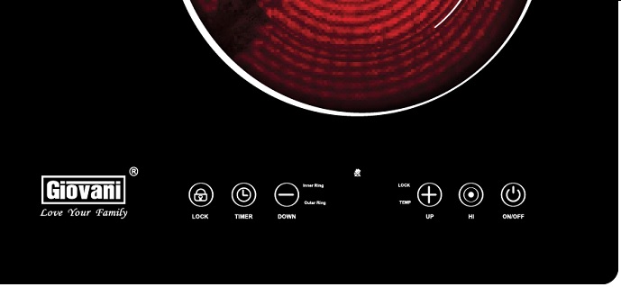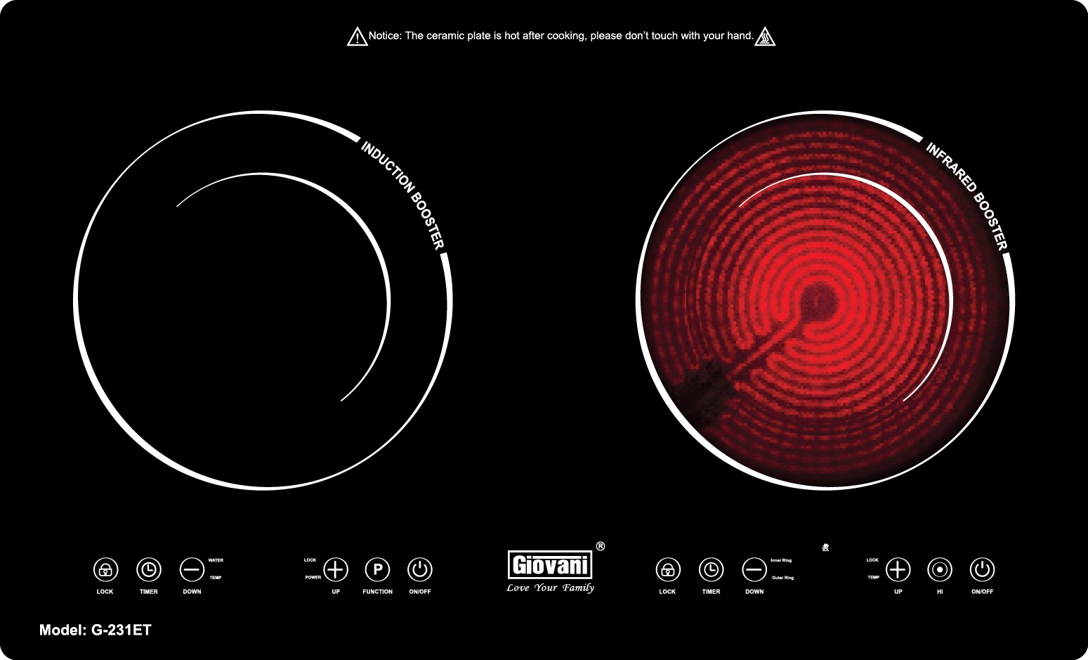 bếp điện từ Giovani đem đến những tiện nghi tối đa cho người dùng: Vùng nấu hồng ngoại hai vòng nhiệt công suất 2300W có thể sử dụng được tất cả các loại xoong nồi và nướng trực tiếp thức ăn (rau củ, thịt,..) trên mặt kính rất thuận tiện. Vùng nấu từ công suất 2000W đun nấu nhanh hơn nhiều so với bếp ga, bếp than củi thông thường, hiệu suất đun nấu lên đến 90% tránh thất thoát nhiệt tiết kiệm điện.