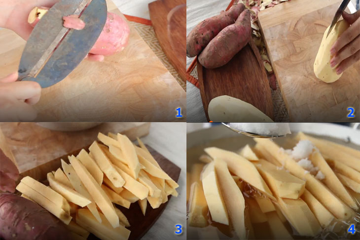 Bắt đầu với việc gọt vỏ khoai lang, rửa sạch và cắt thành từng thanh dài vừa ăn. Ngâm khoai trong nước muối loãng khoảng 15 phút để loại bỏ nhựa và giúp khoai giòn hơn khi chiên.