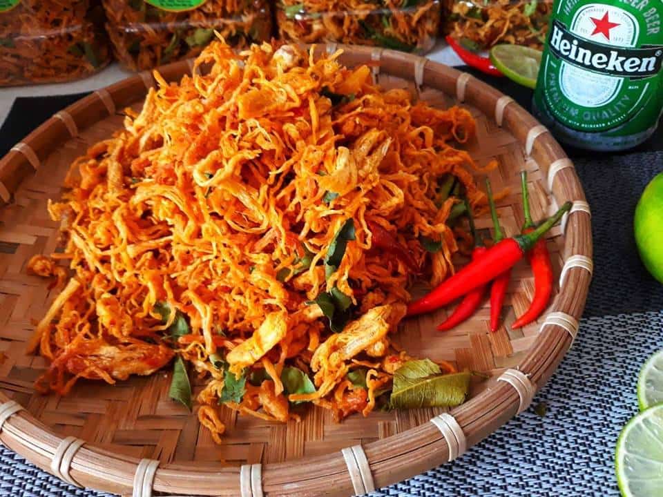 KHÔ GÀ LÁ CHANH khi hoàn thành sẽ có màu vàng đẹp mắt, hương thơm ngào ngạt và vị giòn tan. Mỗi sợi khô gà thấm đều gia vị, hòa quyện với mùi thơm của lá chanh, tạo nên món ăn hấp dẫn khó cưỡng. KHÔ GÀ LÁ CHANH là lựa chọn hoàn hảo để thưởng thức trong mọi dịp, mang đến sự hài lòng cho cả gia đình và bạn bè.