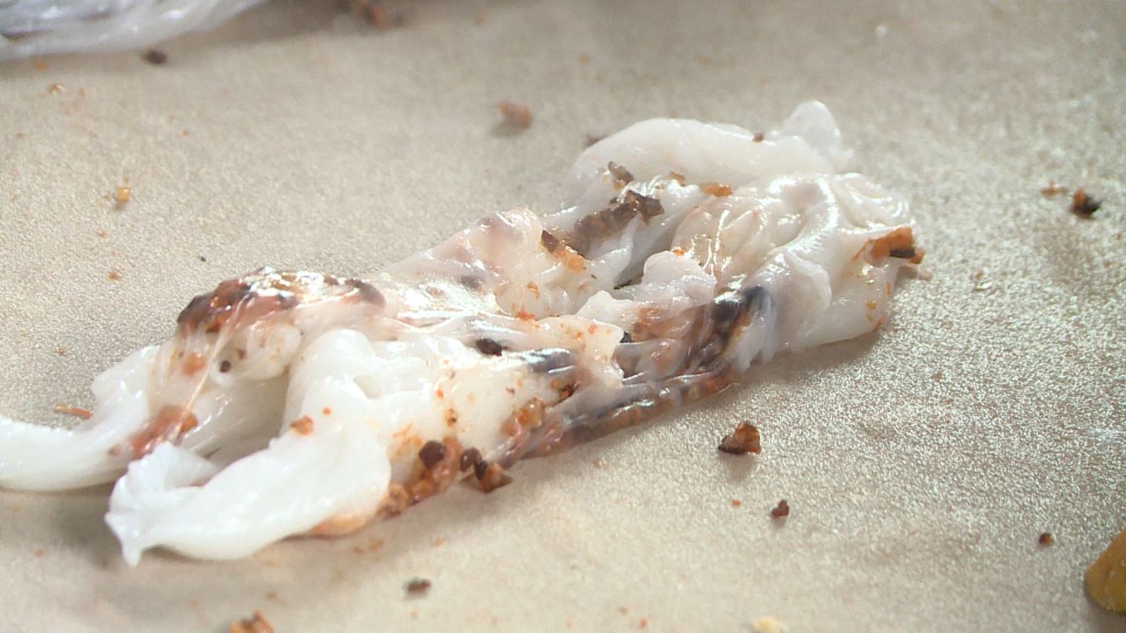 Trải một miếng bột đã được cán mỏng trước đó rải đều thêm tôm, trứng và hẹ lên trên sau đó cuộn tròn lại.
