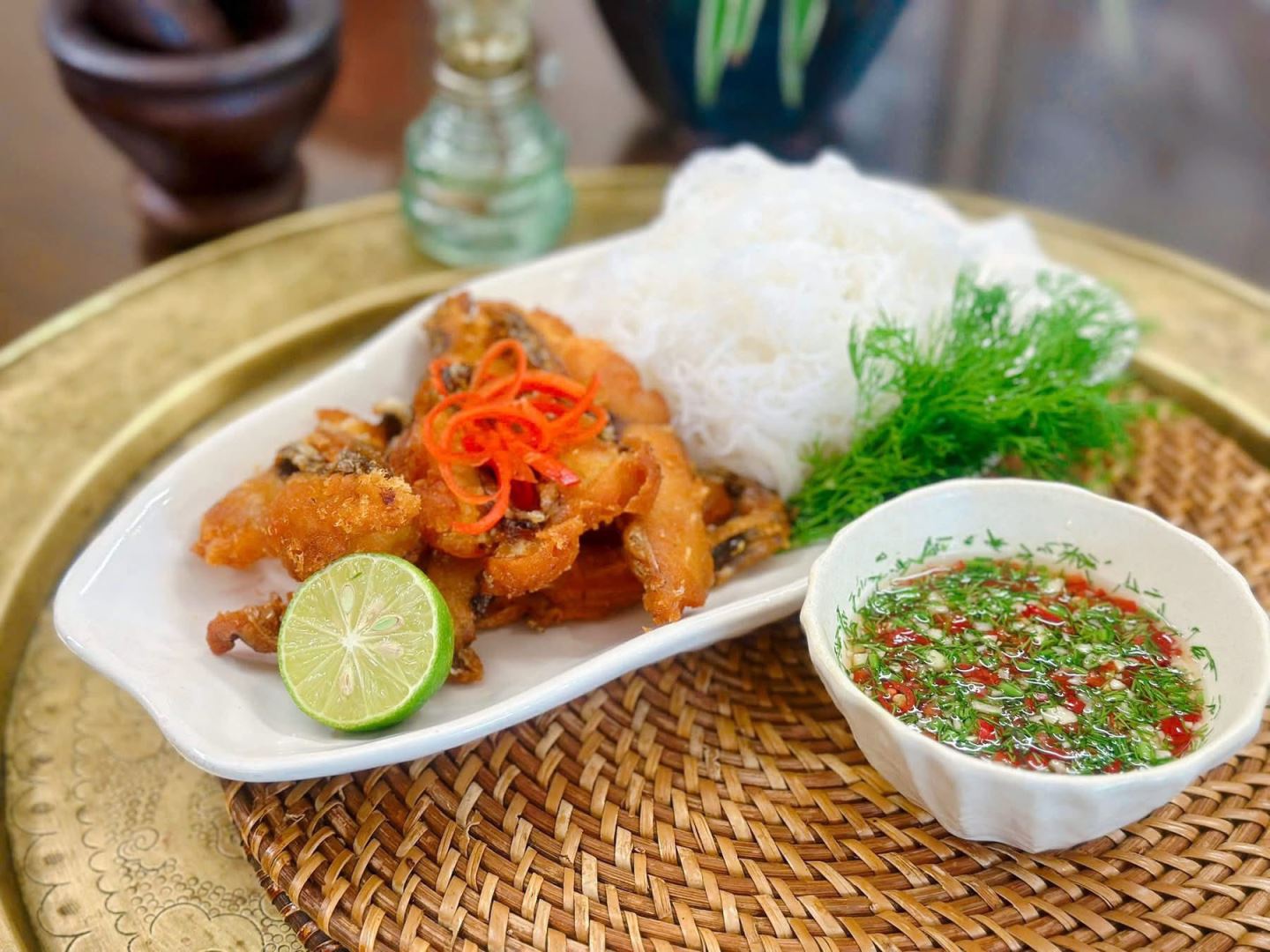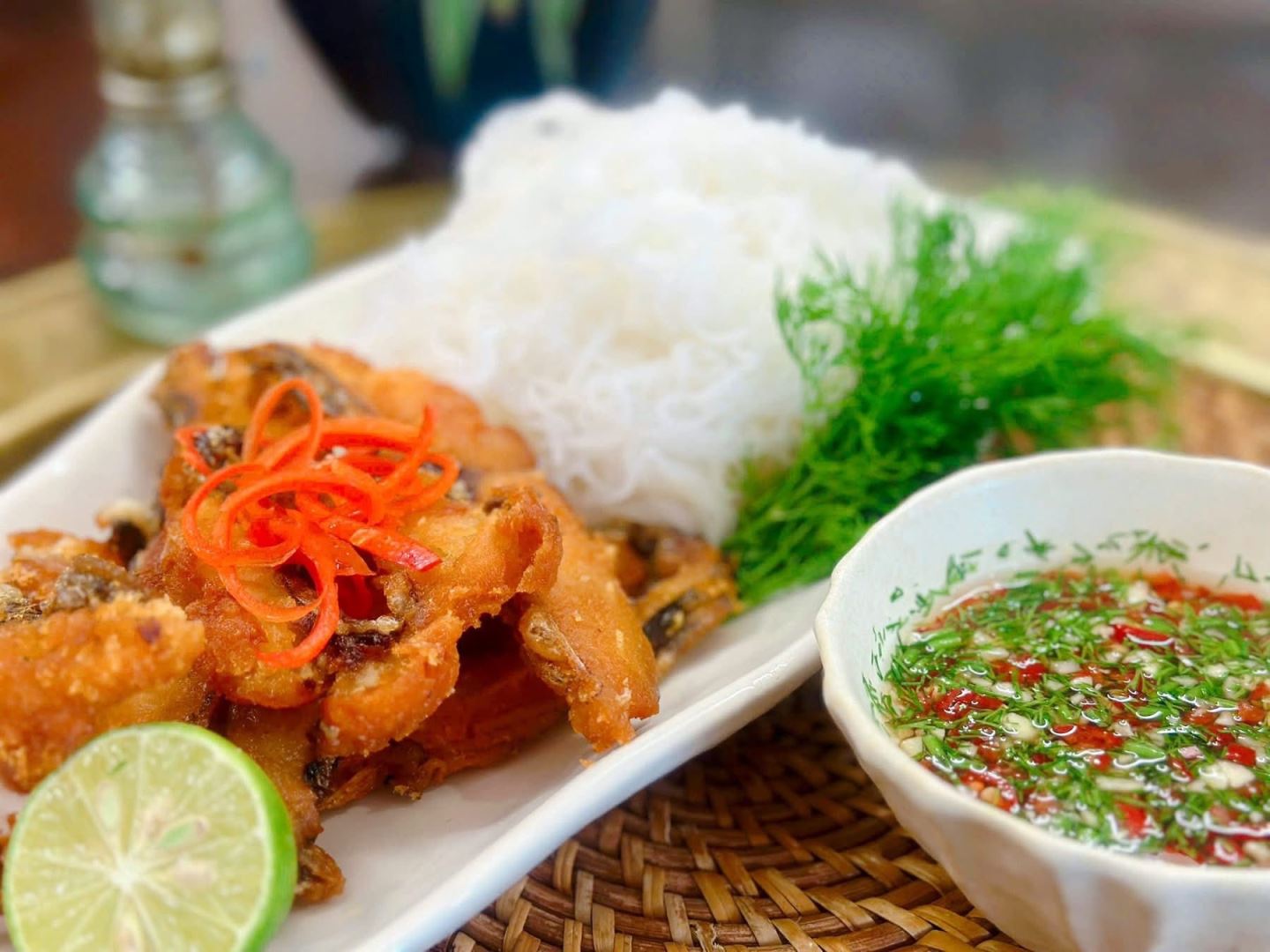 Món ngon bún cá chấm mang đặc trưng của hương vị cá chiên giòn rụm thêm vào đó với vị đậm đà từ nước chấm sẽ khiến bạn vô cùng thích mê đó nhé.