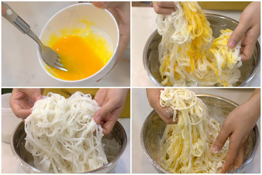 Thêm chút lòng đỏ trứng vào bánh phở sẽ cho màu đẹp mắt nếu như bạn không xào chay