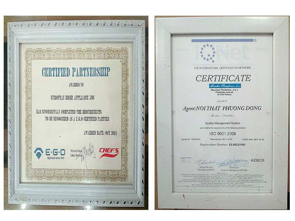 Hình ảnh chứng nhận đại lý của hãng chefs và munchen dành cho bếp Phương Đông
