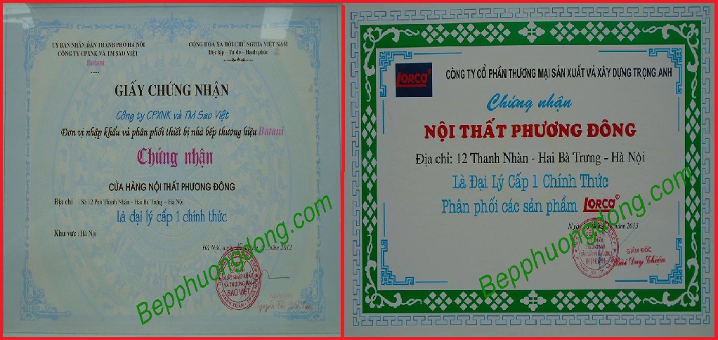 Hình ảnh chứng nhận Bếp Phương Đông là đại lý cấp một các hãng
